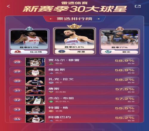 截止至活动次日10月15日的20:00,相比昨日的排名,库里在今日反超杜兰特,成为老哥们心目最受青睐的球星,东契奇则是跌出了前三,名次由目前仍在养伤的欧文取代,欧文的飘逸打法也是粉丝众多,中国球员杨瀚森被超级球星詹姆斯反超,但依旧还在前十的行列中。
