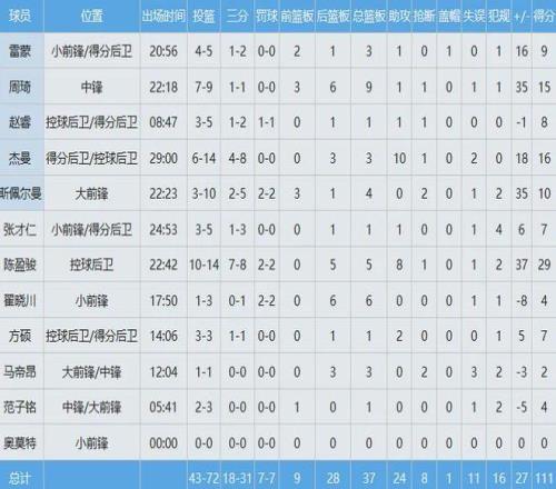 赵睿出战9分钟得到8分1板助1断,周琦上阵22分钟贡献15分9板,两人联手帮助北京队111-84大胜他们的老东家。