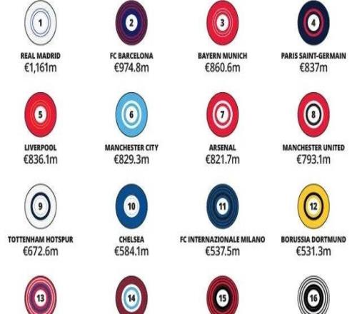 米兰圈国际会计事务所德勤发布24/25赛季足球俱乐部收入报告。德勤俱乐部财富收入Top20:1. 皇家马德里 11.61亿欧2. 巴塞罗那 9.748亿欧3. 拜仁慕尼黑 8.606亿欧4. 巴黎圣日耳